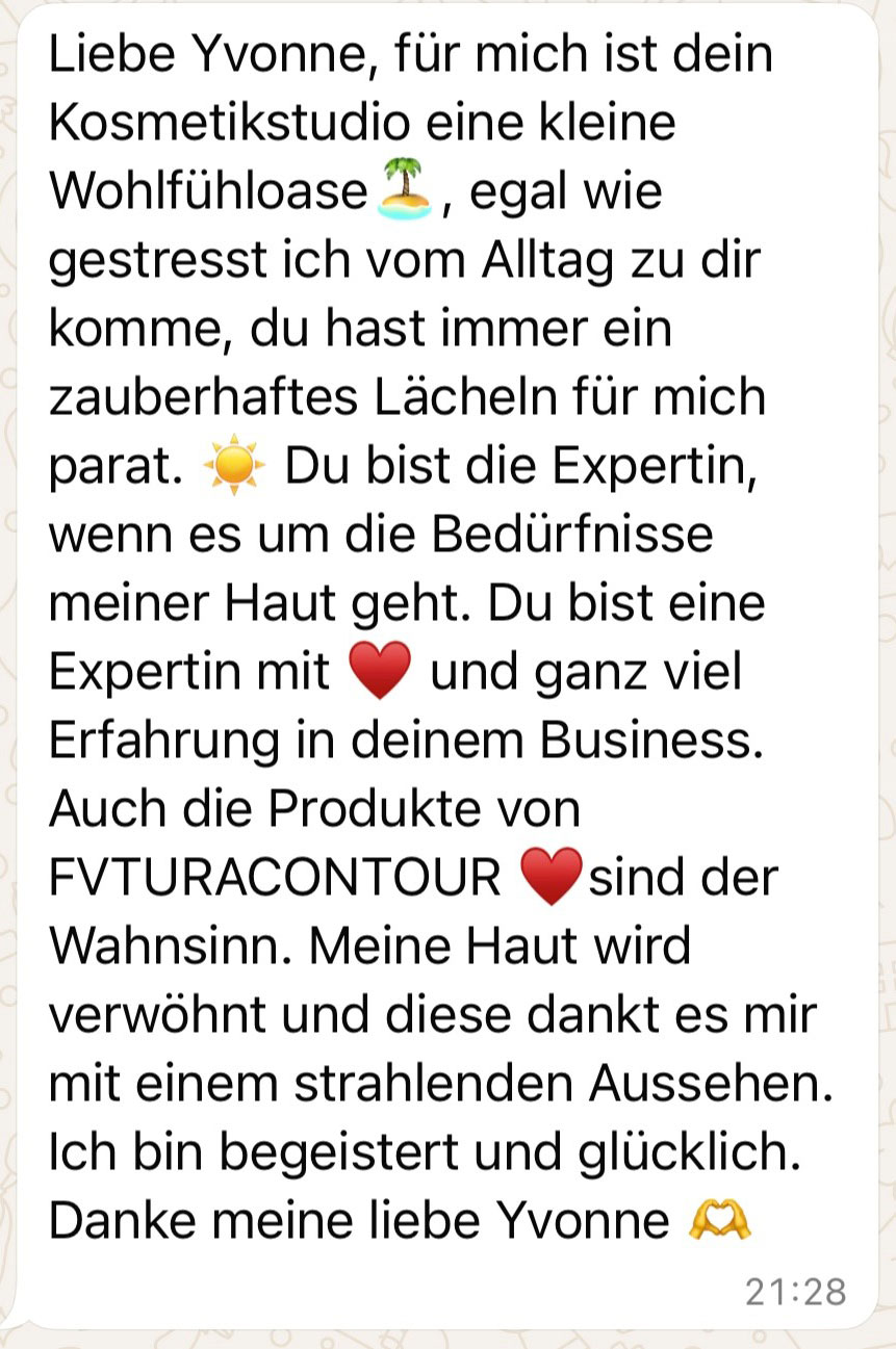 AUSGEZEICHNET Basierend auf 42 Bewertungen Gepostet auf Tina GläserTrustindex überprüft, ob die Originalquelle der Bewertung Google ist. So ein schönes Studio und professionell. Bei der Yvonne fühle ich mich richtig wohl und was Haut angeht, kann man ihr nichts vormachen. Sie kennt sich in dem Bereich mega gut aus. Ihre neuen Hautpflege Produkte lohnen sich um ein besseres Hautbild zubekommen, auch wenn die einen stolzen Preis haben. Danke für alles und das es dich gibt.Gepostet auf Christine MöckelTrustindex überprüft, ob die Originalquelle der Bewertung Google ist. Ja, sehr kompetent ruhige LageGepostet auf Silke HinkeldeiTrustindex überprüft, ob die Originalquelle der Bewertung Google ist. In den BESTEN HÄNDEN 💯Gepostet auf Anne242Trustindex überprüft, ob die Originalquelle der Bewertung Google ist. Super tolles Team, toller neuer Salon und eine rundum gute Behandlung !Gepostet auf Maritta JauerTrustindex überprüft, ob die Originalquelle der Bewertung Google ist. Cooles Ambiente...schöne Lage ( fern ab der Hektik).Nette InhaberinGepostet auf AnjaTrustindex überprüft, ob die Originalquelle der Bewertung Google ist. Der neue, sehr schöne und liebevoll eingerichtete Salon, machen einen Termin zu einem kleinen Erholungshiglight. Die individuellen und einzigartigen Nageldesigns 💅 sind einfach fantastisch. Es ist eine kleine Wohlfühlinsel. Macht bitte genau so weiter! 🙂Gepostet auf Nancy JacobTrustindex überprüft, ob die Originalquelle der Bewertung Google ist. Absolut empfehlenswert. Zuvorkommend, zuverlässig und mega freundlich.